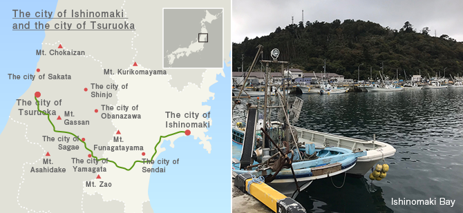 The city of Tsuruoka on the Japan Sea, and the city of Ishinomaki on the Pacific side of the island of Honshu are at about the same latitude; a distance of 135km as the crow flies. By car, the route can be drawn as a gradual arc, which goes south and eastward from the city of Tsuruoka as it passes the south side of Mt. Gassan, crosses the Yamagata Basin, goes between Mt. Funagatayama and Mt. Zao, and then heads up north. The mileage amounts to a little over 200km.