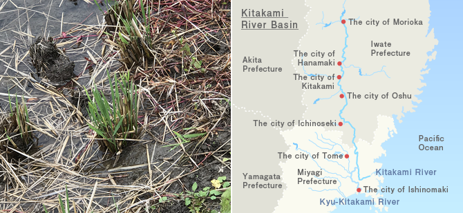 Kitakami River is the largest river in the Tohoku region, with a catchment area of 10,150 sq kilometers, and a length of 249 kilometers for the trunk river. This river runs longitudinally through Iwate and Miyagi prefectures, and divides into Kitakami River and Kyu-Kitakami River downstream around Tome, Miyagi Prefecture. The area about 15 kilometers from the estuary of Kyu-Kitakami River will be the focus of our next report.