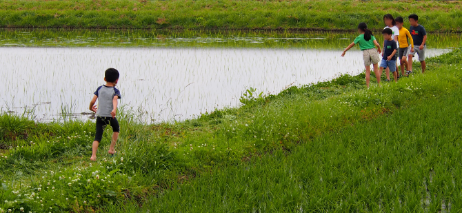 6月9日に、都会の子供たちを招いて田植えイベントが行われましたが、そしてこれは、田伝むしが水田の魅力を次世代に伝える継続した努力の一環ですが、その際に植えた幼苗が、7月17日に伺うと、ノロに押し潰されることもなく、しっかり生着して成長を始めていました。その水田の景色の中で、畦道の雑草は綺麗に刈り取られています。