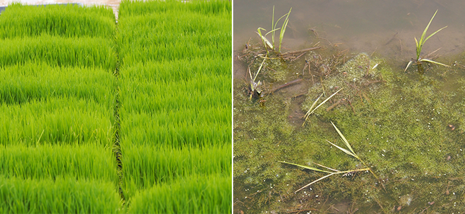 しかし、田植えの時期が遅いと気温が高くなっているので水田には「ノロ」と呼ばれる藻が発生しています。アオミドロのことでしょう。このノロが風に吹き寄せられて畦に近く漂って来ますが、幼苗に覆いかぶさってその成長を阻害するそうです。農家はノロを除き畦の上に捨てる。田んぼのアクとりです。