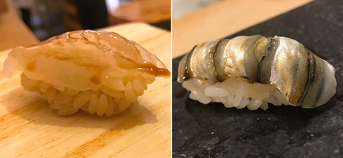 ところで、田伝むしに紹介されて、ここのササニシキを使っている寿司屋を、神奈川と大阪に訪ねたことがあります。当方べつに舌が利く訳でも目が利く訳でもないので、料理の論評は不可能ですが、いずれの寿司も、御馳走様と言って店を出てからしばらく歩くとまた戻りたくなる、あと味の良い寿司でした。ずっと付き合っていきたいあと味。そのネタとシャリの握り合わせは、「君子の交わりは淡きこと水のごとし」。希少な米ササニシキは、これだから、さっぱりした食感を慕う寿司屋さんに重宝されているんだなと感じた次第です。以下に、その寿司の艶姿を少しだけ写真でお裾分けして、本稿を終わりたいと思います。