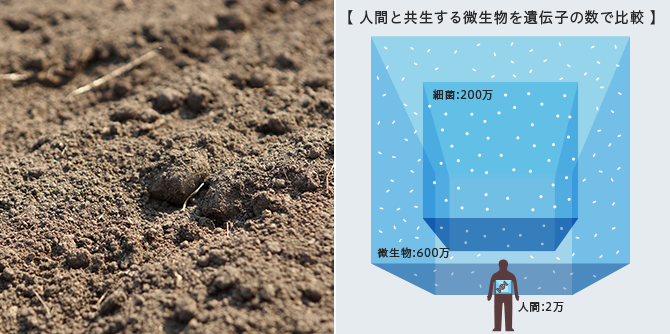 土の中、植物の根のすぐ外側は「根圏」と呼ばれ、ここには多数の微生物がいて、根と共存共栄している。土中の物質を根が吸収できる形に変えたり、害をなす細菌の侵入を拒んだりしています。