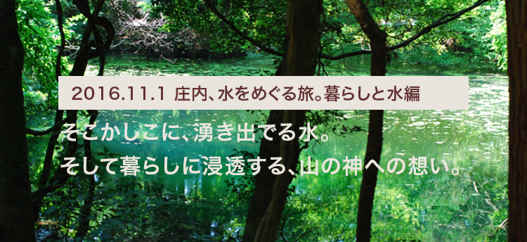 庄内、水をめぐる旅。暮らしと水編(2016.11.1) そこかしこに、湧き出でる水。そして暮らしに浸透する、山の神への想い。 庄内、水をめぐる旅。子どもと水編(2016.10.1) 変わりゆく水辺。変わらない水辺。子どもたちに感じてほしい、営みがある。 庄内、水をめぐる旅。農家と水編(2016.9.1) すべての水田に公平に水を。先人たちの、知恵と努力の足跡。 庄内、水をめぐる旅。森の水編(2016.8.1) 水の恵み、水への畏れ、そして水との共存。森からはじまる、数百年の物語り。