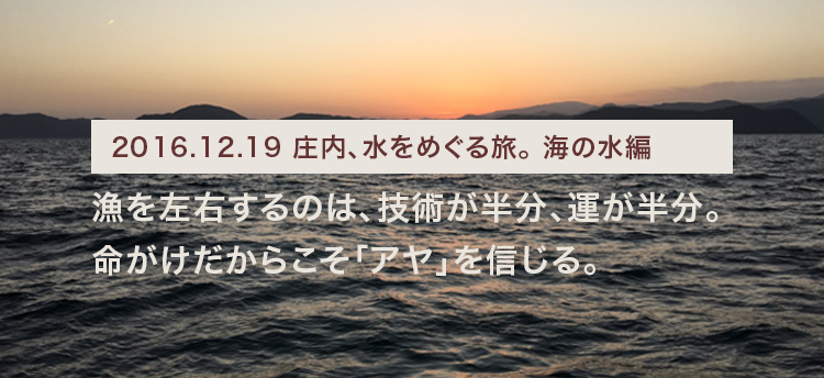 庄内、水をめぐる旅。海の水編(2016.12.19) 漁を左右するのは、技術が半分、運が半分。命がけだからこそ「アヤ」を信じる。 庄内、水をめぐる旅。暮らしと水編(2016.11.1) そこかしこに、湧き出でる水。そして暮らしに浸透する、山の神への想い。 庄内、水をめぐる旅。子どもと水編(2016.10.1) 変わりゆく水辺。変わらない水辺。子どもたちに感じてほしい、営みがある。 庄内、水をめぐる旅。農家と水編(2016.9.1) すべての水田に公平に水を。先人たちの、知恵と努力の足跡。 庄内、水をめぐる旅。森の水編(2016.8.1) 水の恵み、水への畏れ、そして水との共存。森からはじまる、数百年の物語り。