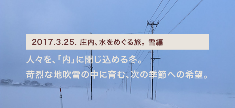 庄内、水をめぐる旅。循環する水編(2017.6.30) 繰り返される水のサイクル。再び、数百年の物語のはじまりの場所へ。 庄内、水をめぐる旅。雪編(2017.3.25) 人々を、「内」に閉じ込める冬。苛烈な地吹雪の中に育む、次の季節への希望。 庄内、水をめぐる旅。海の水編(2016.12.19) 漁を左右するのは、技術が半分、運が半分。命がけだからこそ「アヤ」を信じる。 庄内、水をめぐる旅。暮らしと水編(2016.11.1) そこかしこに、湧き出でる水。そして暮らしに浸透する、山の神への想い。 庄内、水をめぐる旅。子どもと水編(2016.10.1) 変わりゆく水辺。変わらない水辺。子どもたちに感じてほしい、営みがある。 庄内、水をめぐる旅。農家と水編(2016.9.1) すべての水田に公平に水を。先人たちの、知恵と努力の足跡。 庄内、水をめぐる旅。森の水編(2016.8.1) 水の恵み、水への畏れ、そして水との共存。森からはじまる、数百年の物語り。